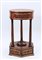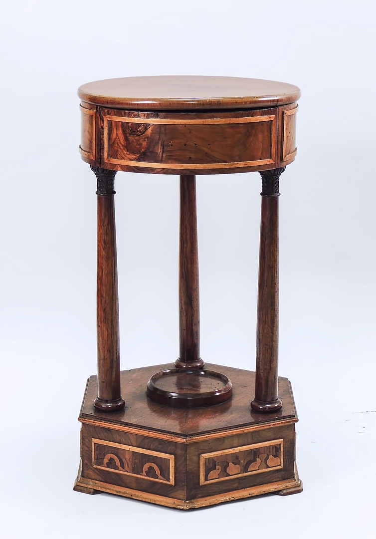 TAVOLINO TONDO IMPIALLACCIATO IN PIUMA E RADICA DI NOCE - BURR AND WALNUT TABLE seconda metà del XIX secolo - second half of 19th Century un cassetto nella fascia, tre sostegni a colonna con capitelli corinzi su base esagonale, difetti h cm 71, diam cm 39
