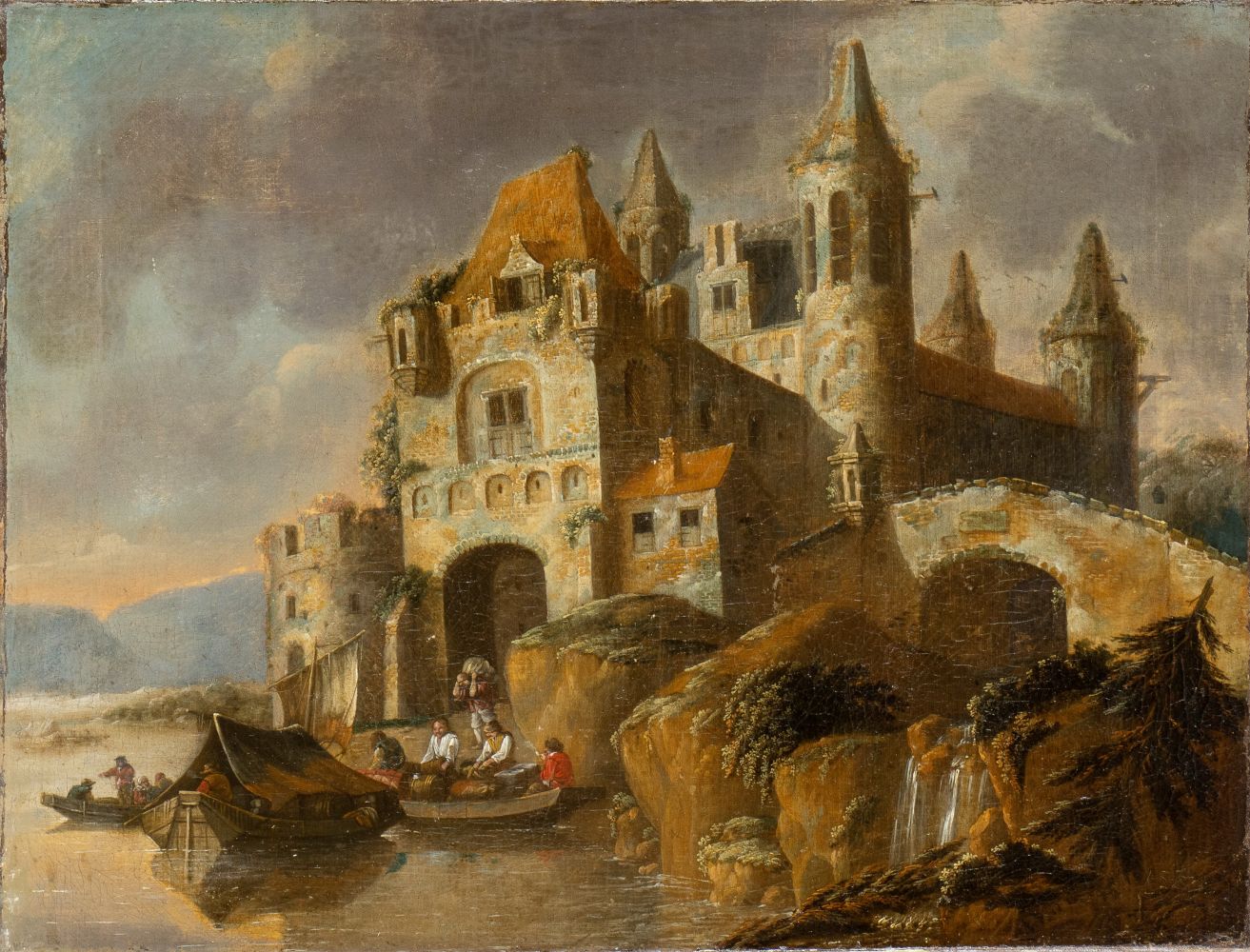 Paesaggio con imbarcazioni e castello sulla riva di un fiume