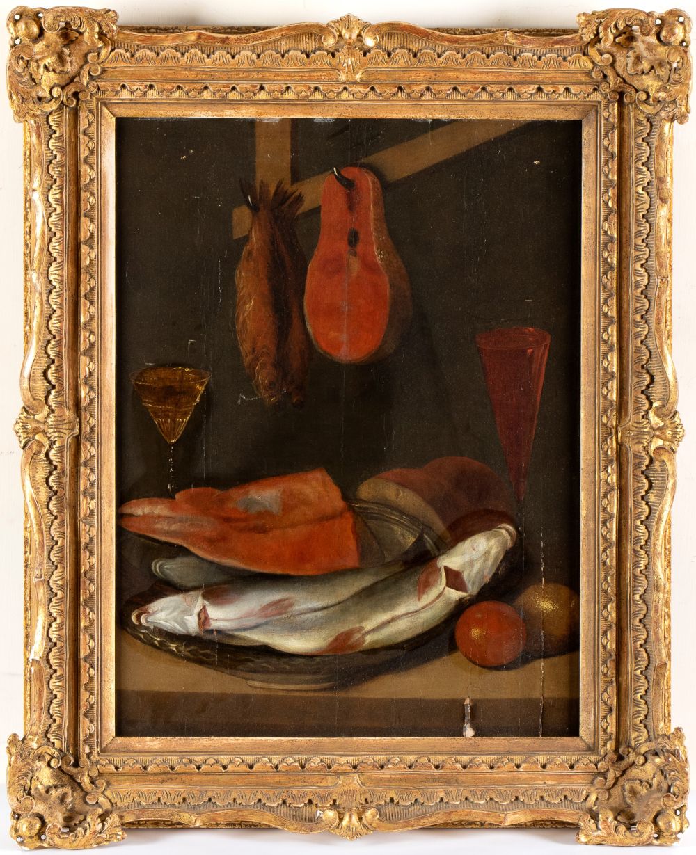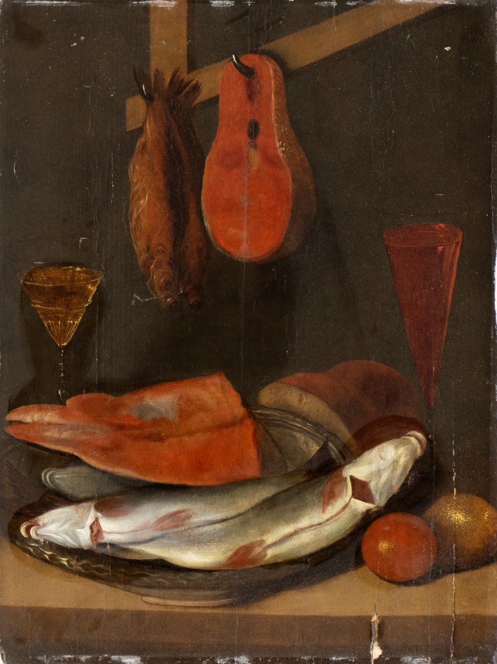 Lotto 285 | Artista spagnolo, XVIII secolo () Natura morta con calici, pesci e un trancio...