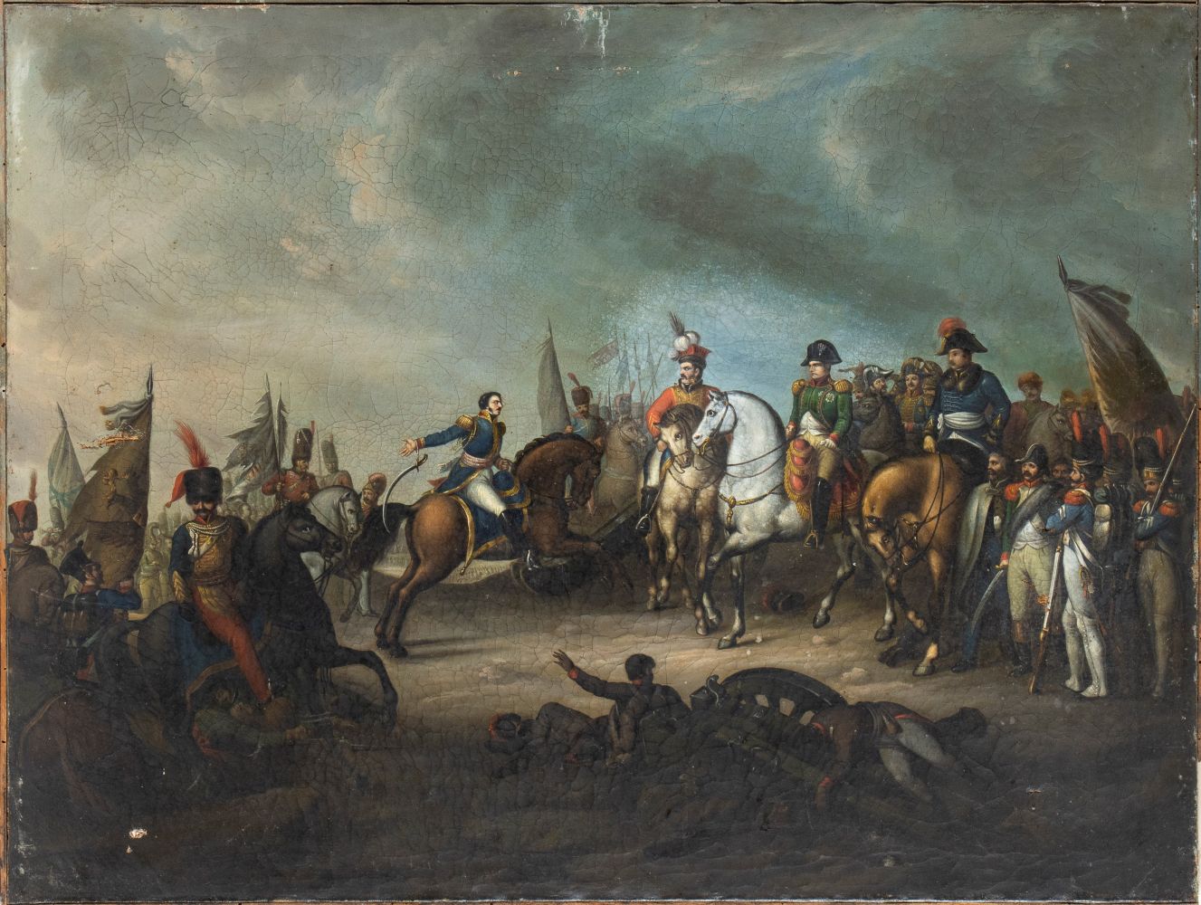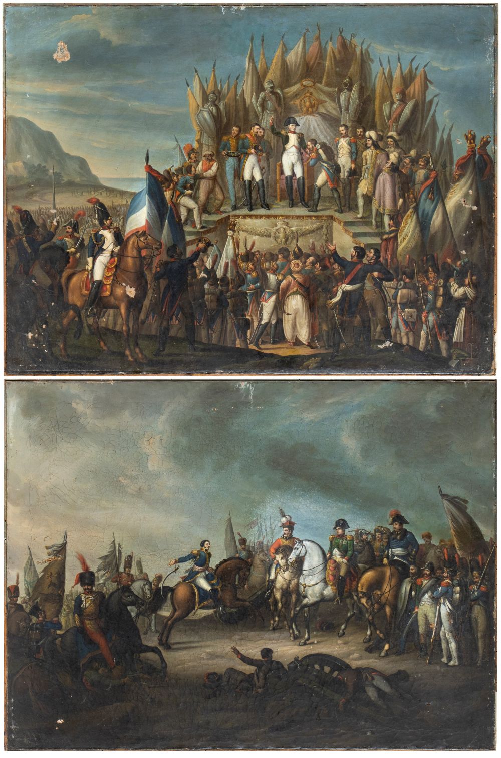 a) Napoleone distribuisce le prime insegne della Legion d'Onore Imperiale ai campi di Boulogne, 16 agosto 1804; b) Joachim Murat e Napoleone nella battaglia di Austerlitz. Coppia di dipinti