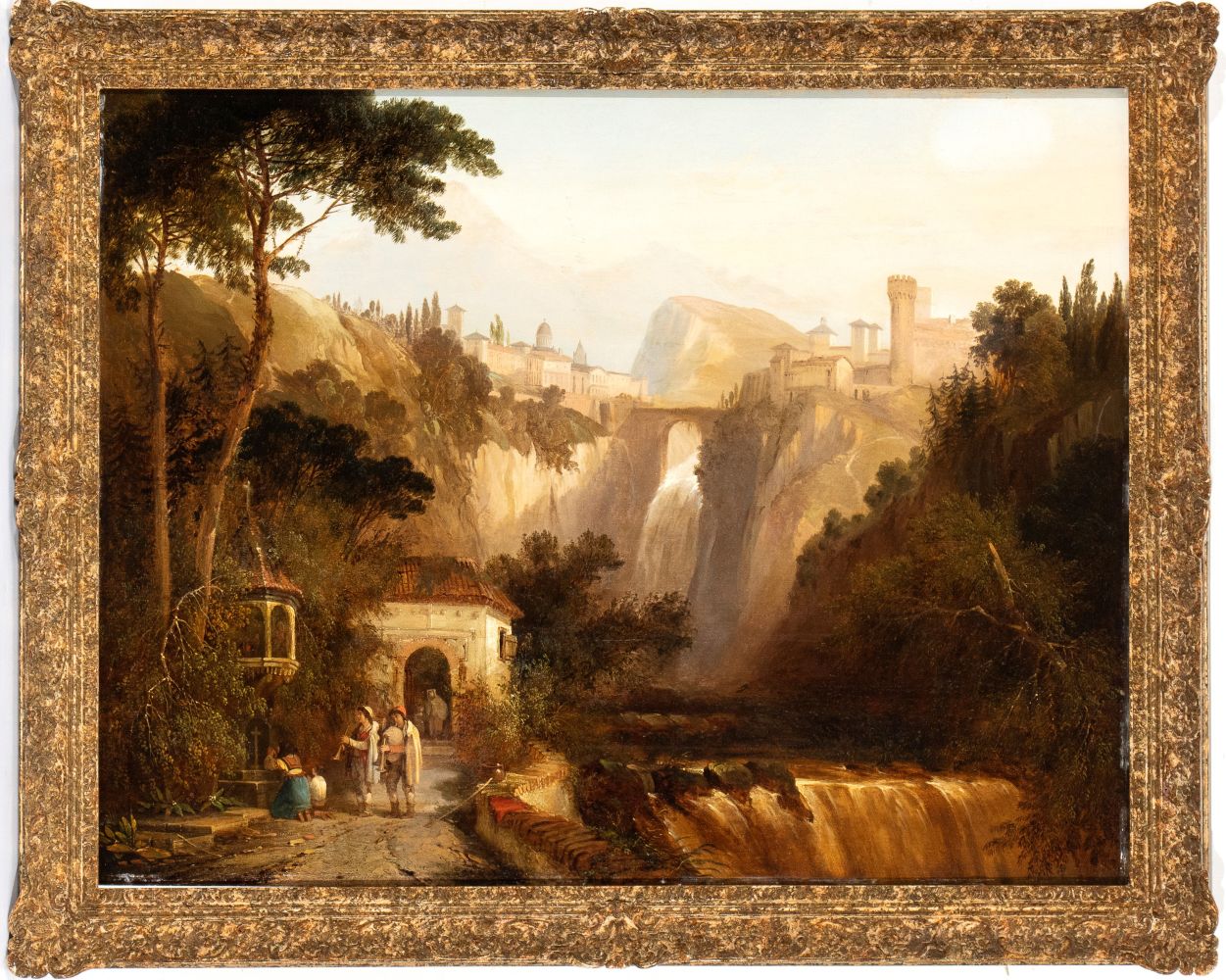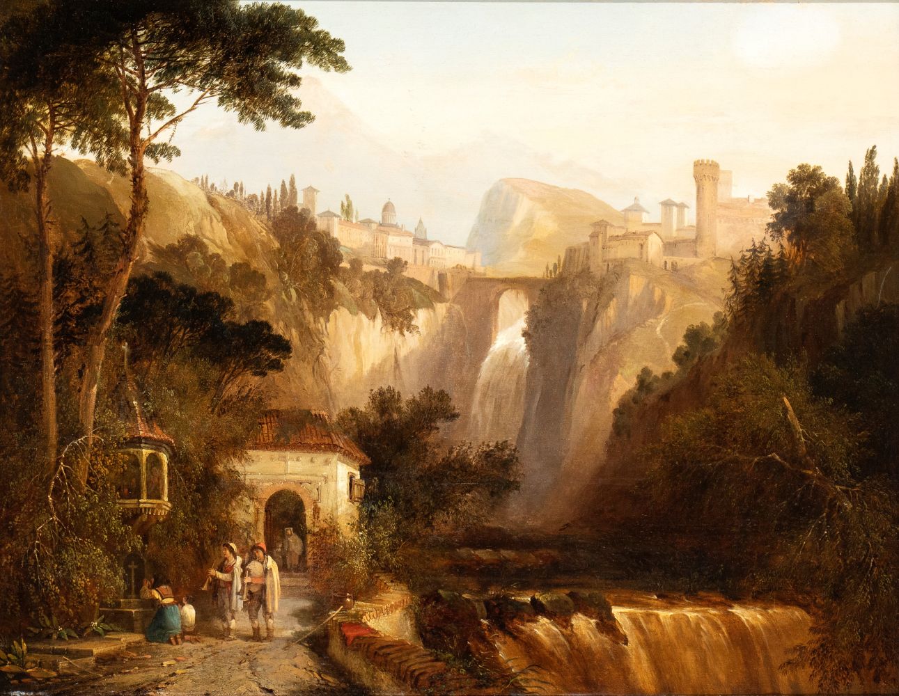 Paesaggio laziale con cascata, ponte, borgo e zampognari di fronte a un'edicola votiva (Veduta fantasiosa di Tivoli?)