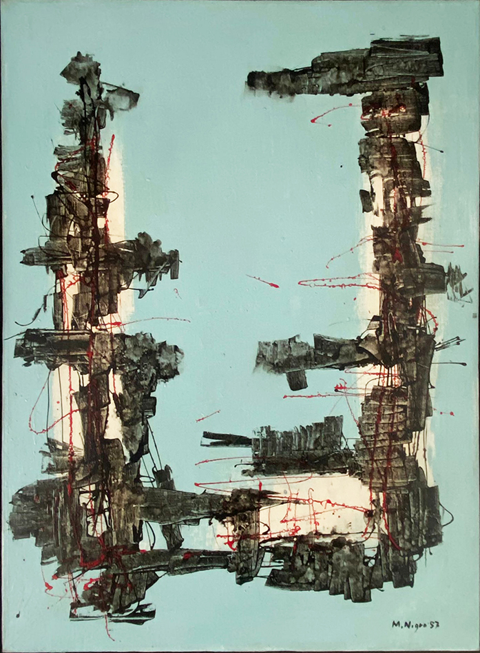 Mario Nigro, Olio su tela, 100x73cm, S.T. (Composizione in blu, nero e rosso), 1957; Firma e datazione al fronte; Etichetta della Galleria d'Arte Anfiteatro (PD) al retro; Archivio Nigro N. 0424.0.3