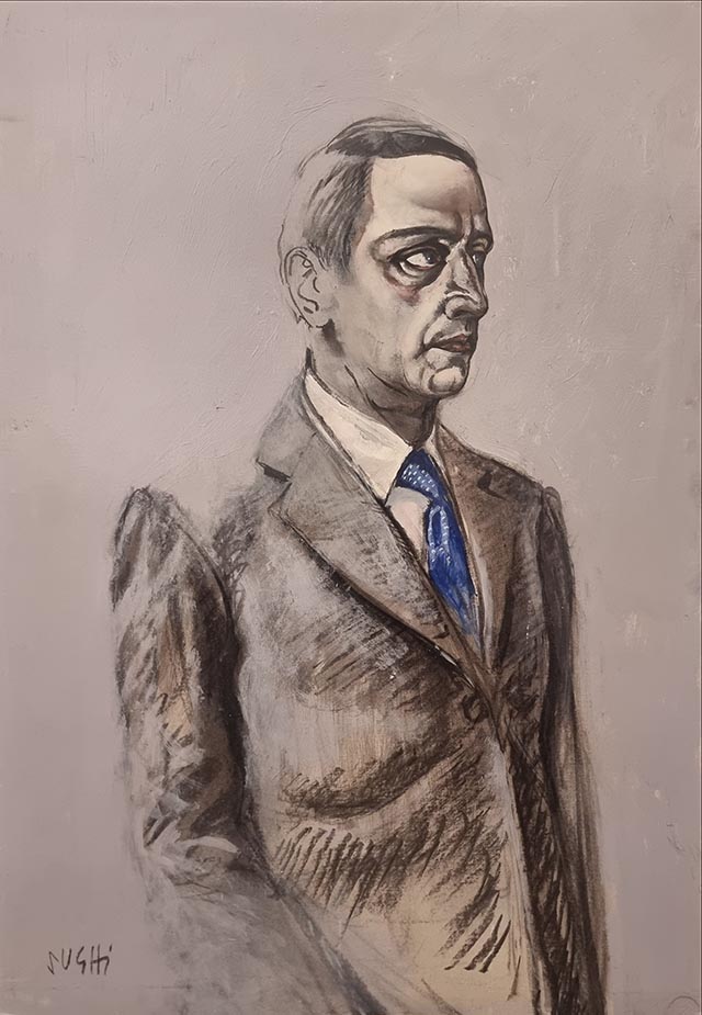 Alberto Sughi, Tempera su legno, 70x50cm, Personaggio da "La cena", 1975; Autentica dell'artista su foto