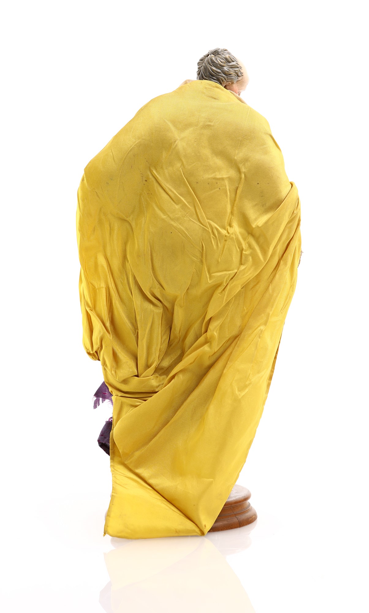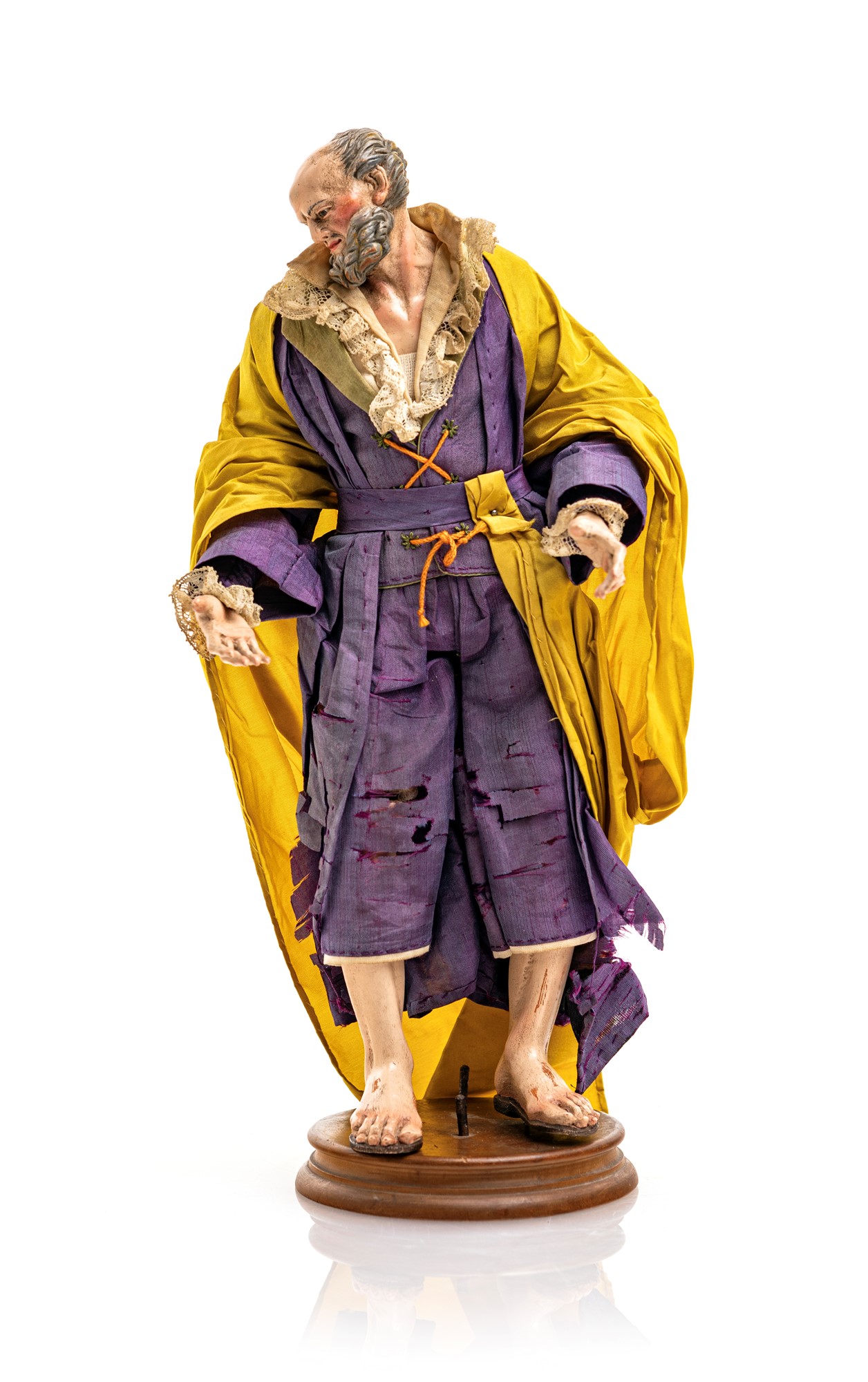 San Giuseppe camicia bianca aperta orlata di merletto, tunica viola, mantello in seta gialla altezza cm 29
