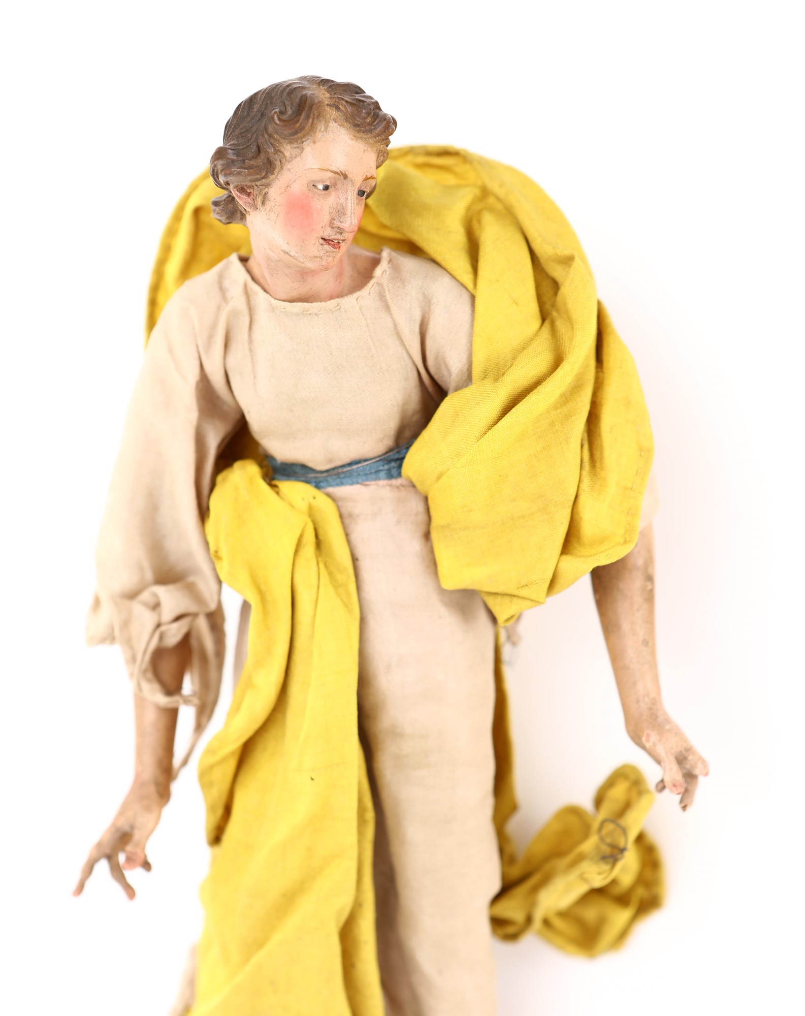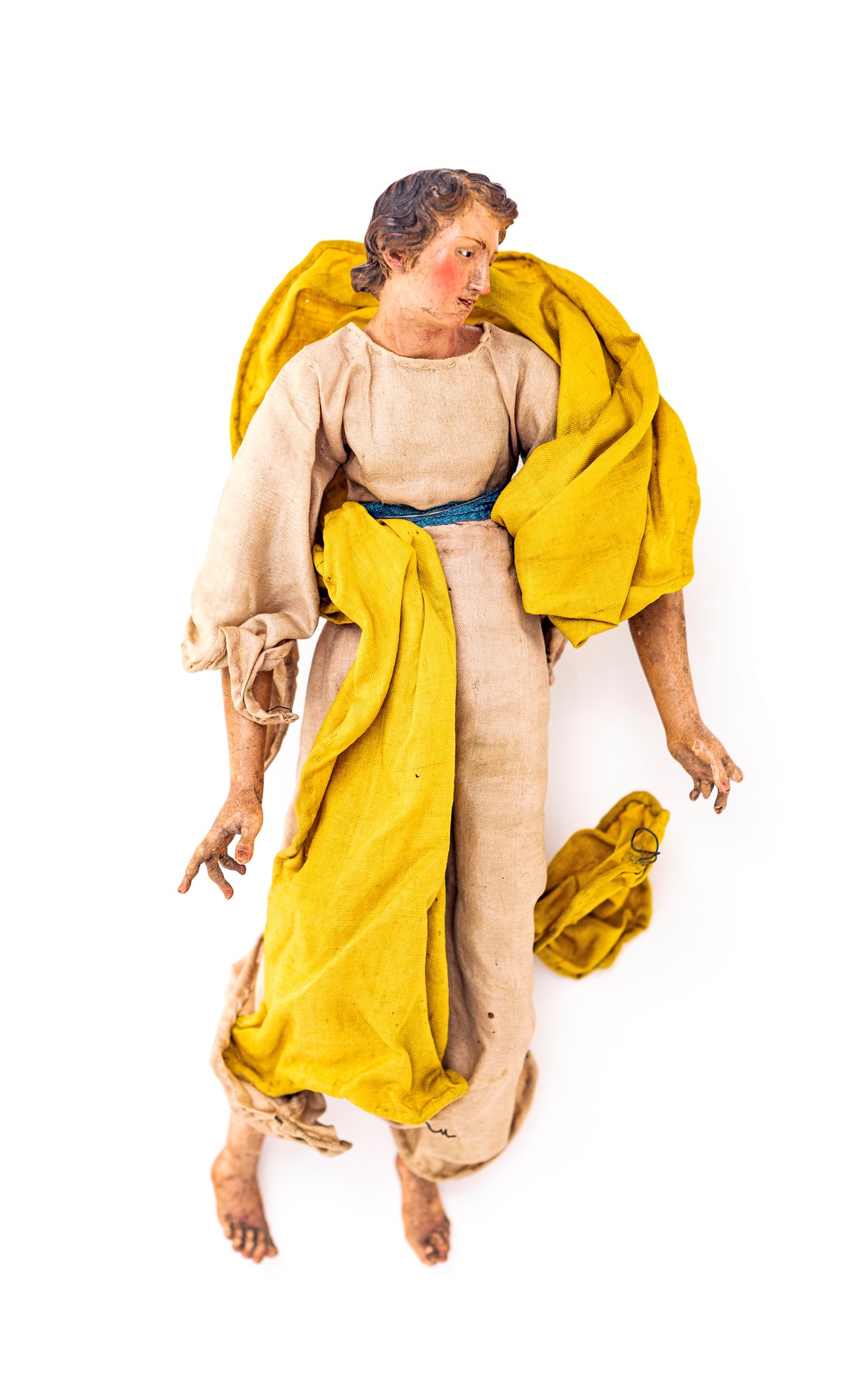 Angelo con bocca socchiusa e svolazzi gialli tunica avorio con sottile fascia azzurra in vita. Lievi mancanze