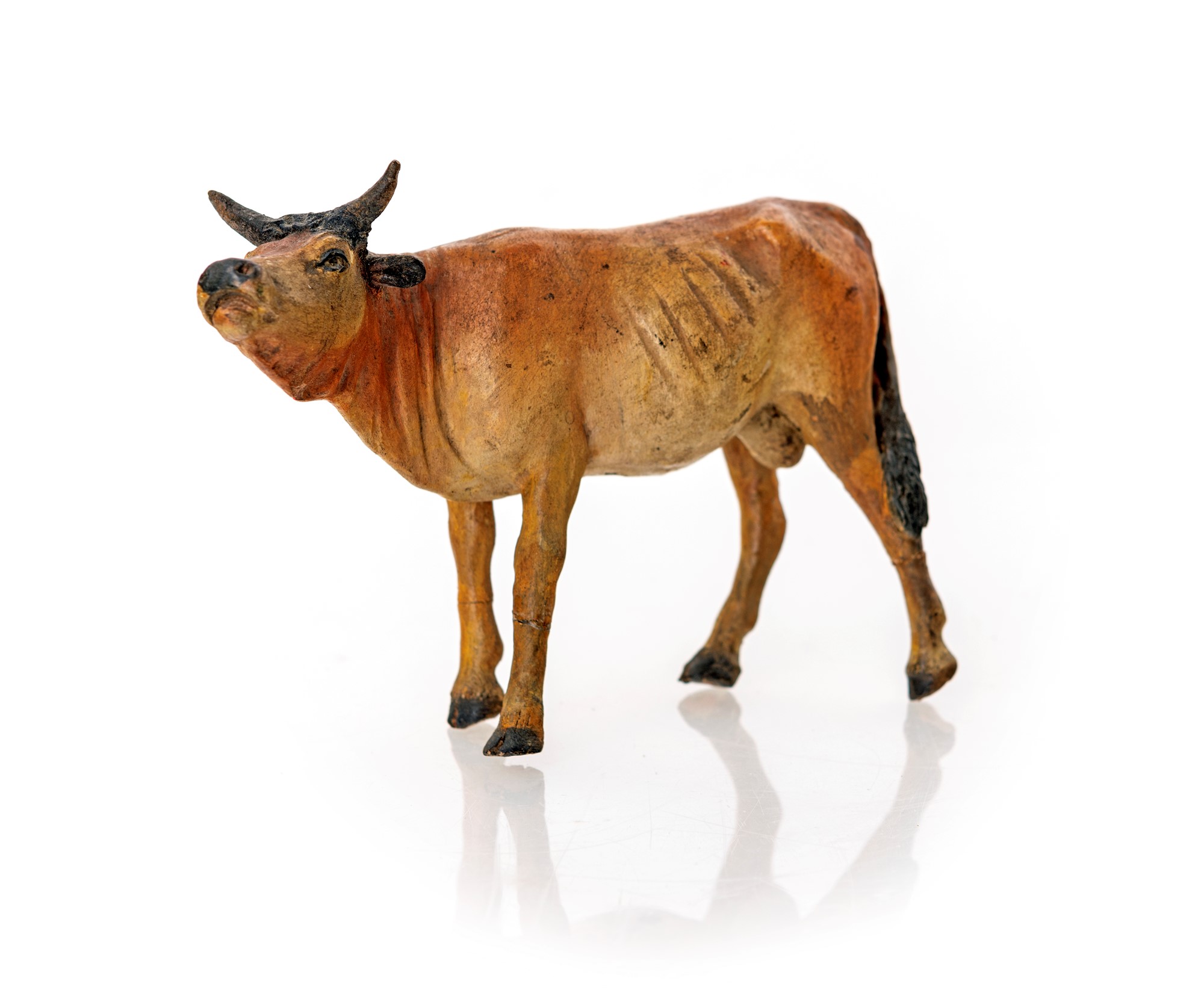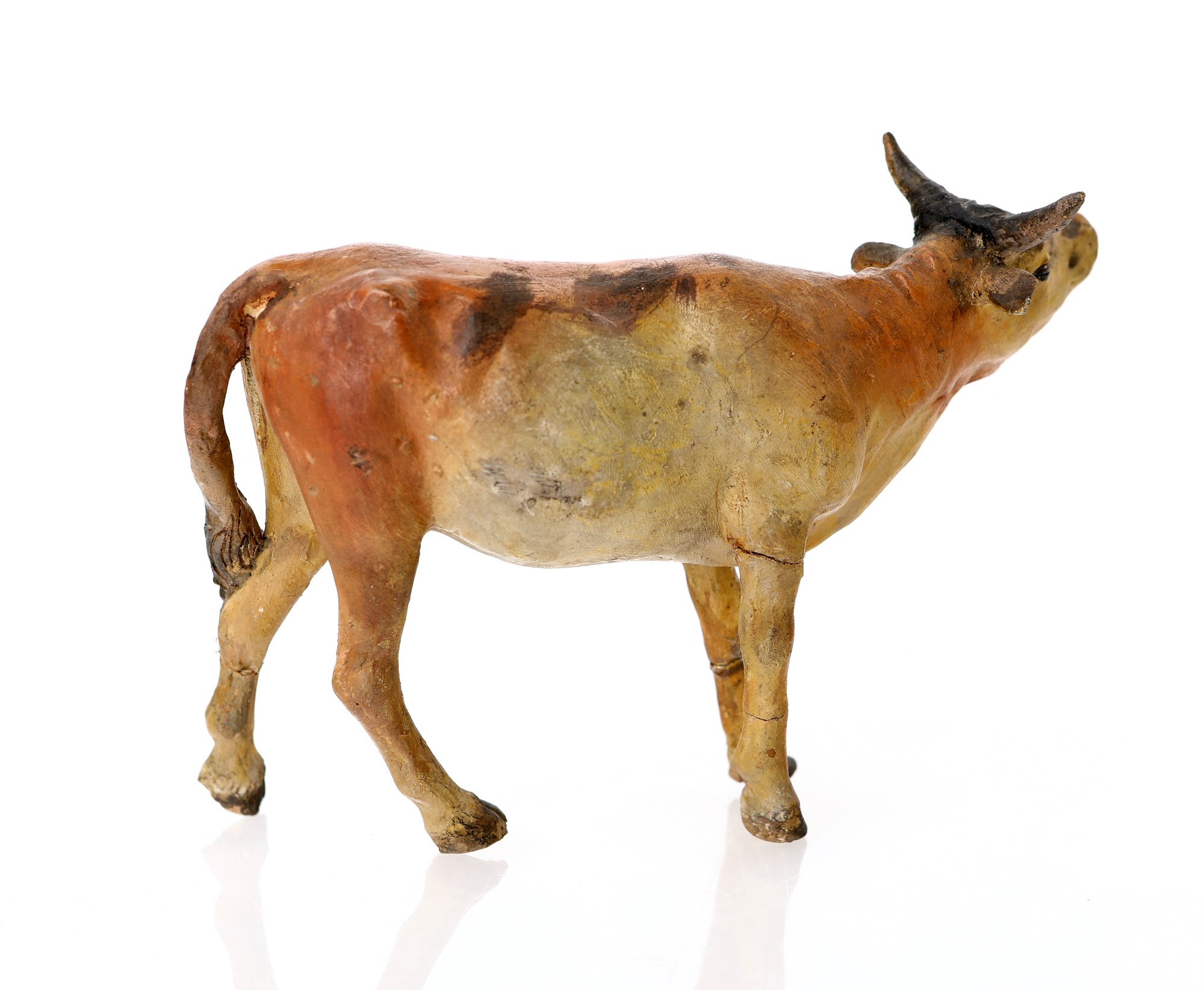 Bue muggente con manto fulvo ed occhi dipinti; restauri terracotta policroma cm 14x20x5