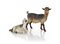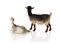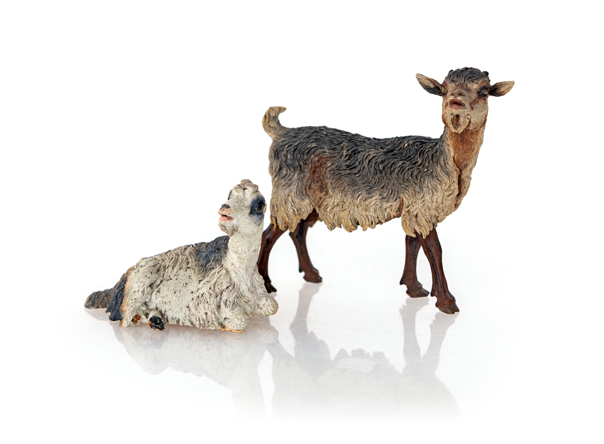 Due caprette una stante ed una accosciata, con vello bianco e grigio. Difetti e piccole mancanze terracotta policroma cm 10x11x3 e cm 6x8,5x5