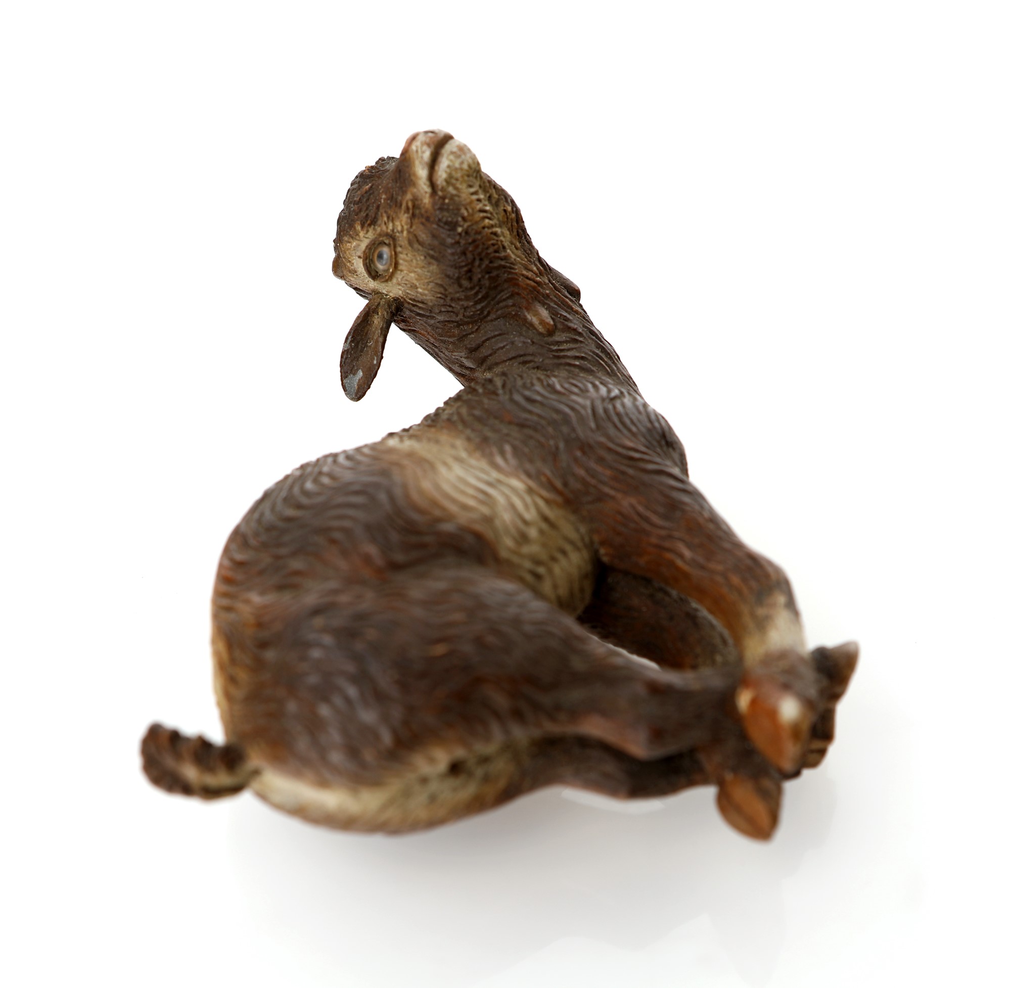 Agnellino incaprettato manto bruno, occhi di vetro terracotta policroma cm 8x9x2,5