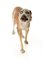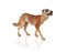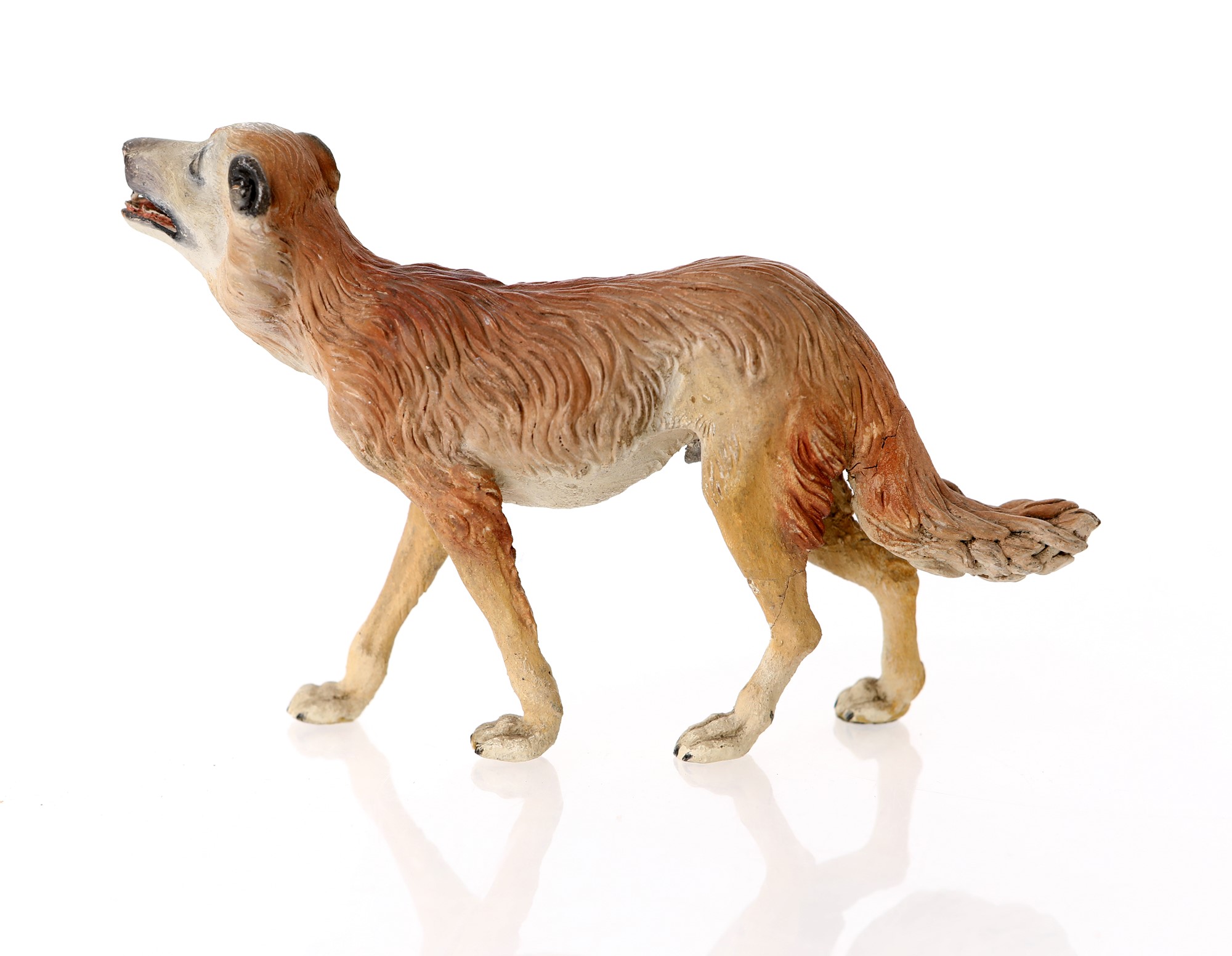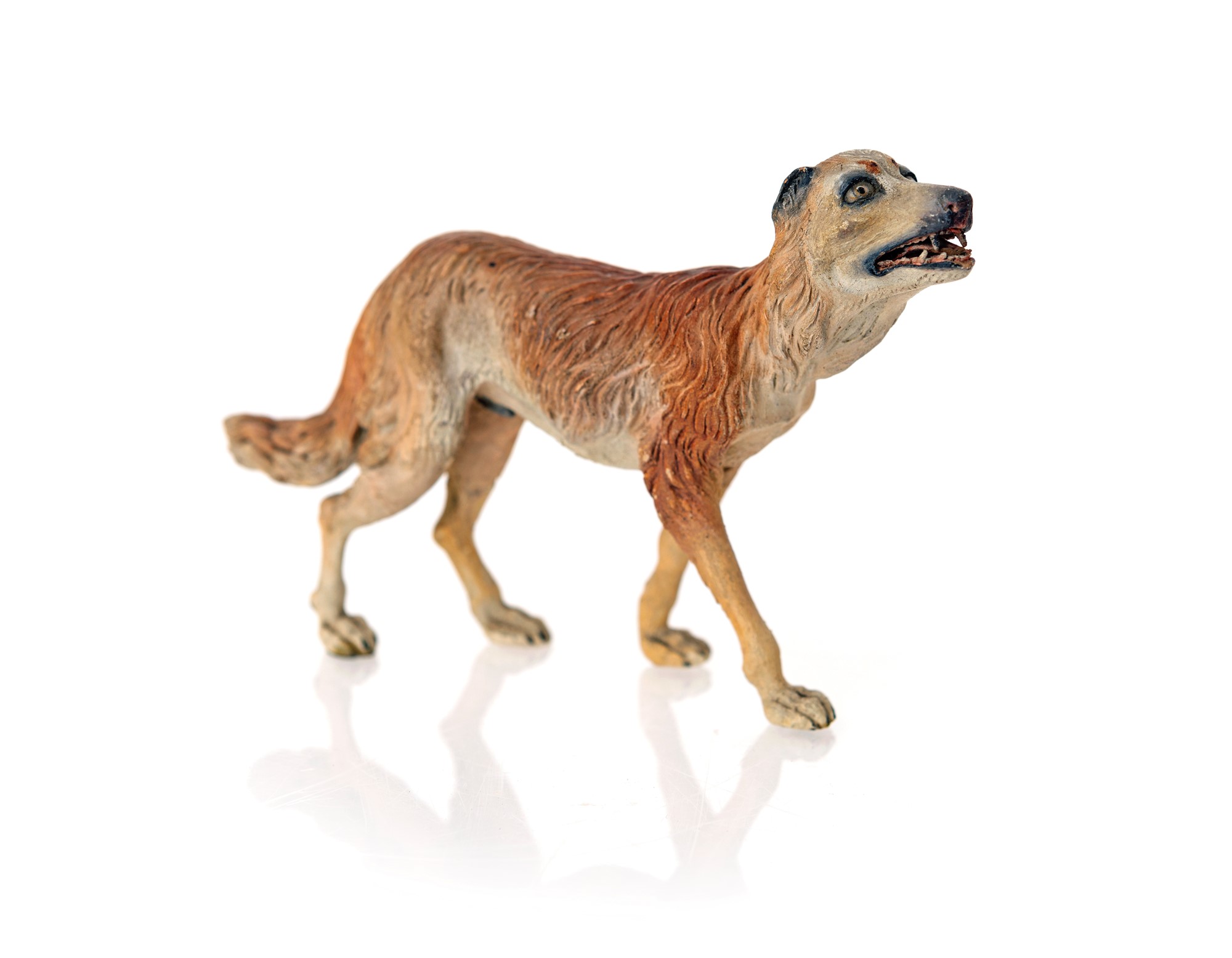 Cane pastore bocca aperta, occhi di vetro, coda mossa. Restauri terracotta policroma cm 9x14x3 ca.