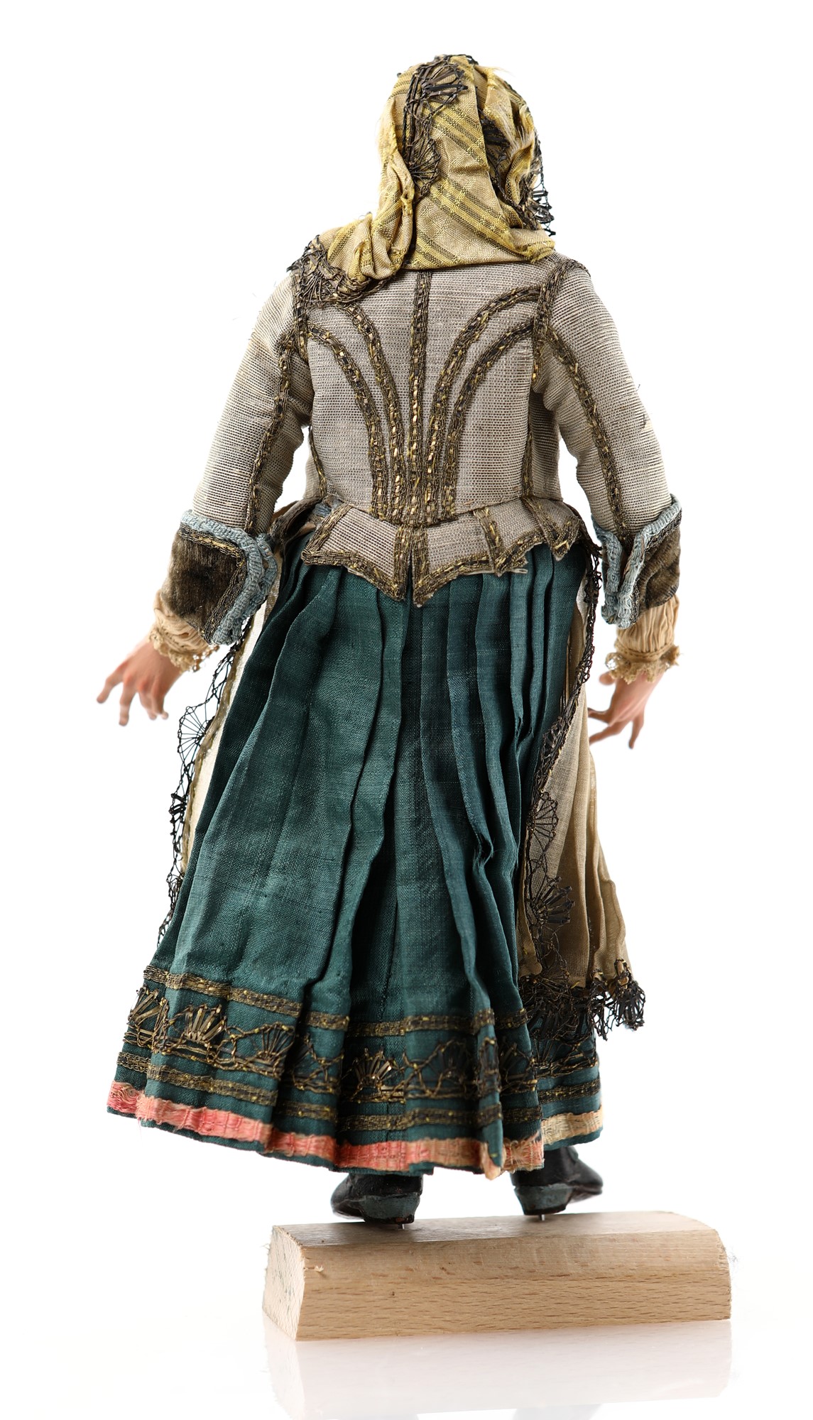 Donna anziana ricca camicia plissettata con merletti, corsetto con ricami, ampia gonna rosa con sopragonna a pieghe con fascia azzurra in vita e marsina in tinta con ricami dorati