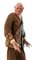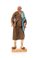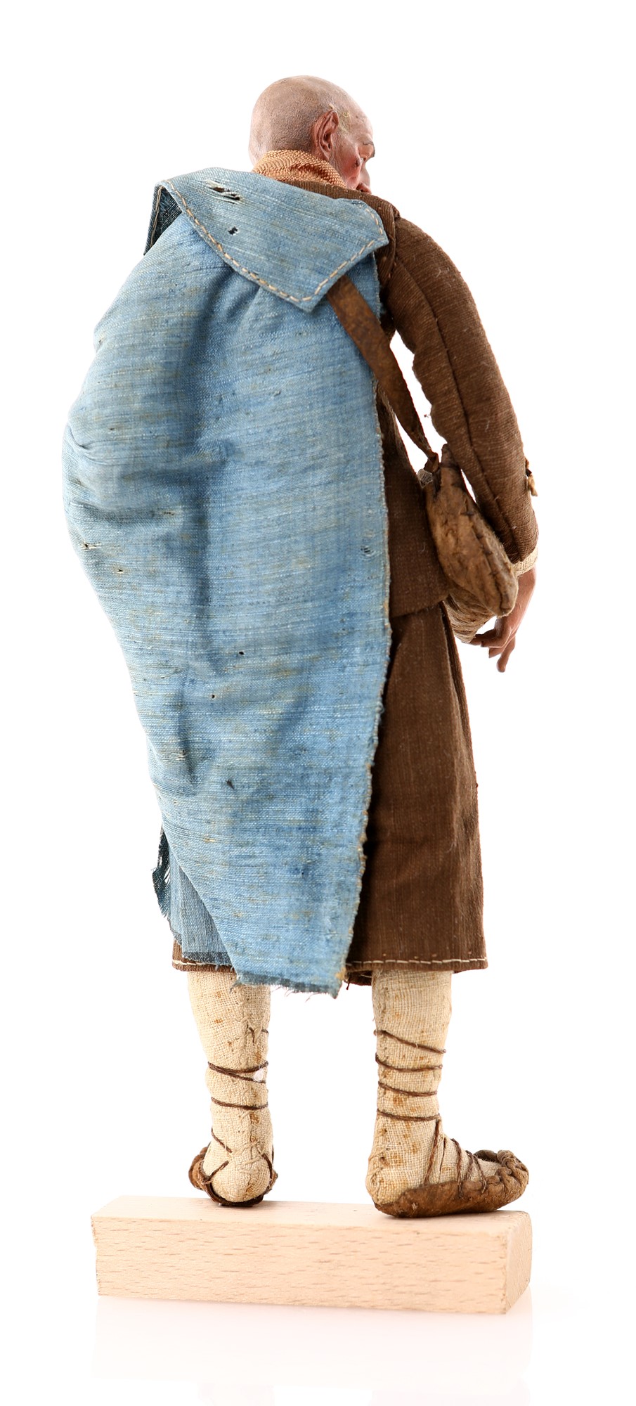 Rustico calvo con porro sulla fronte giacca e pantaloni marroni, mantello azzurro posato sulla spalla sinistra, ciocie ai piedi. Accessori: bisaccia