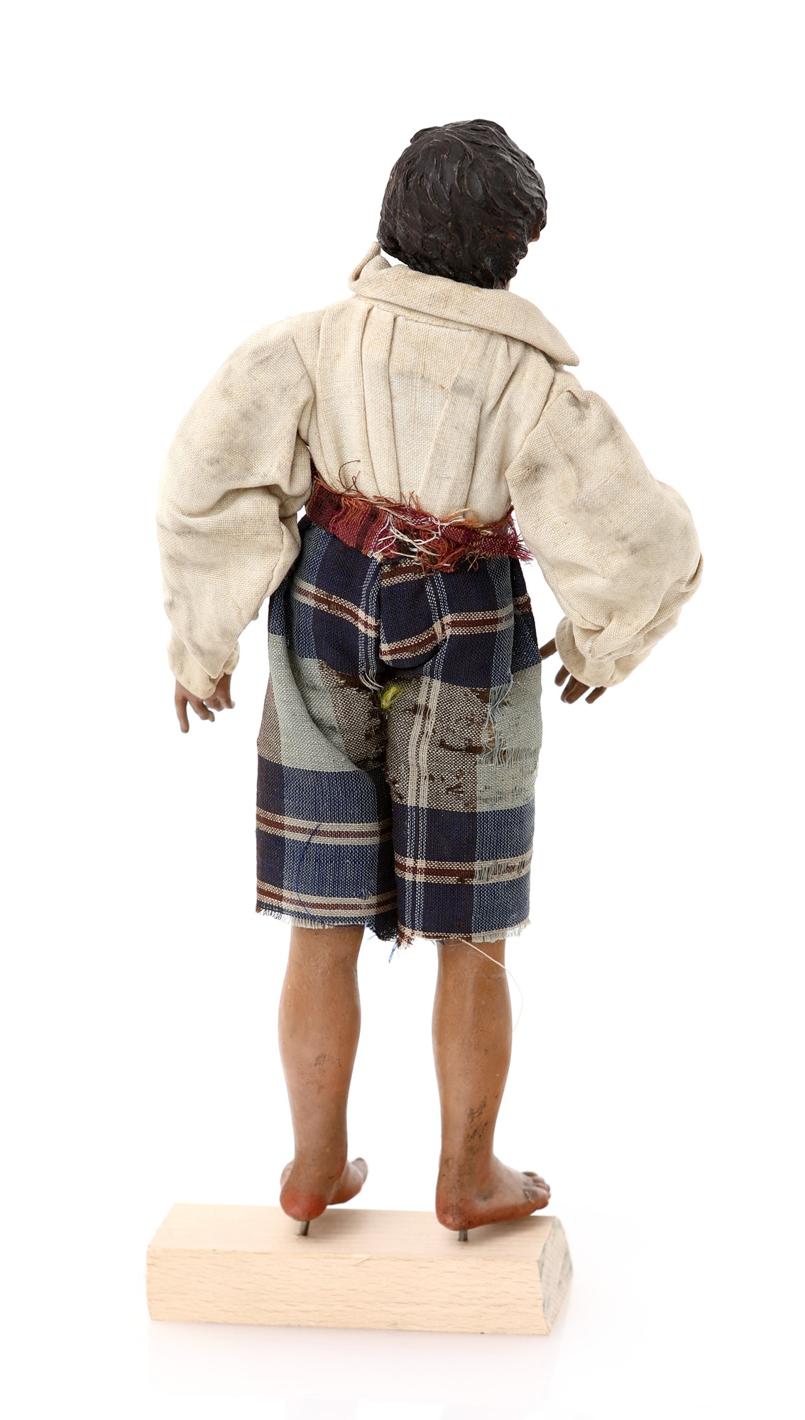 Pastore della meraviglia ritratto scalzo con bocca aperta e pantaloni corti a quadri; ampia camicia bianca aperta sul petto. Lievi mancanze altezza cm 26
