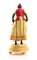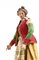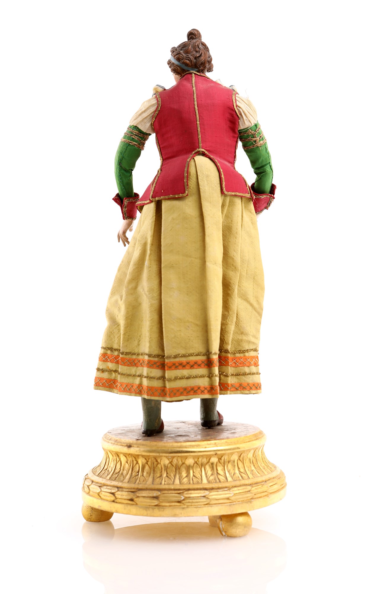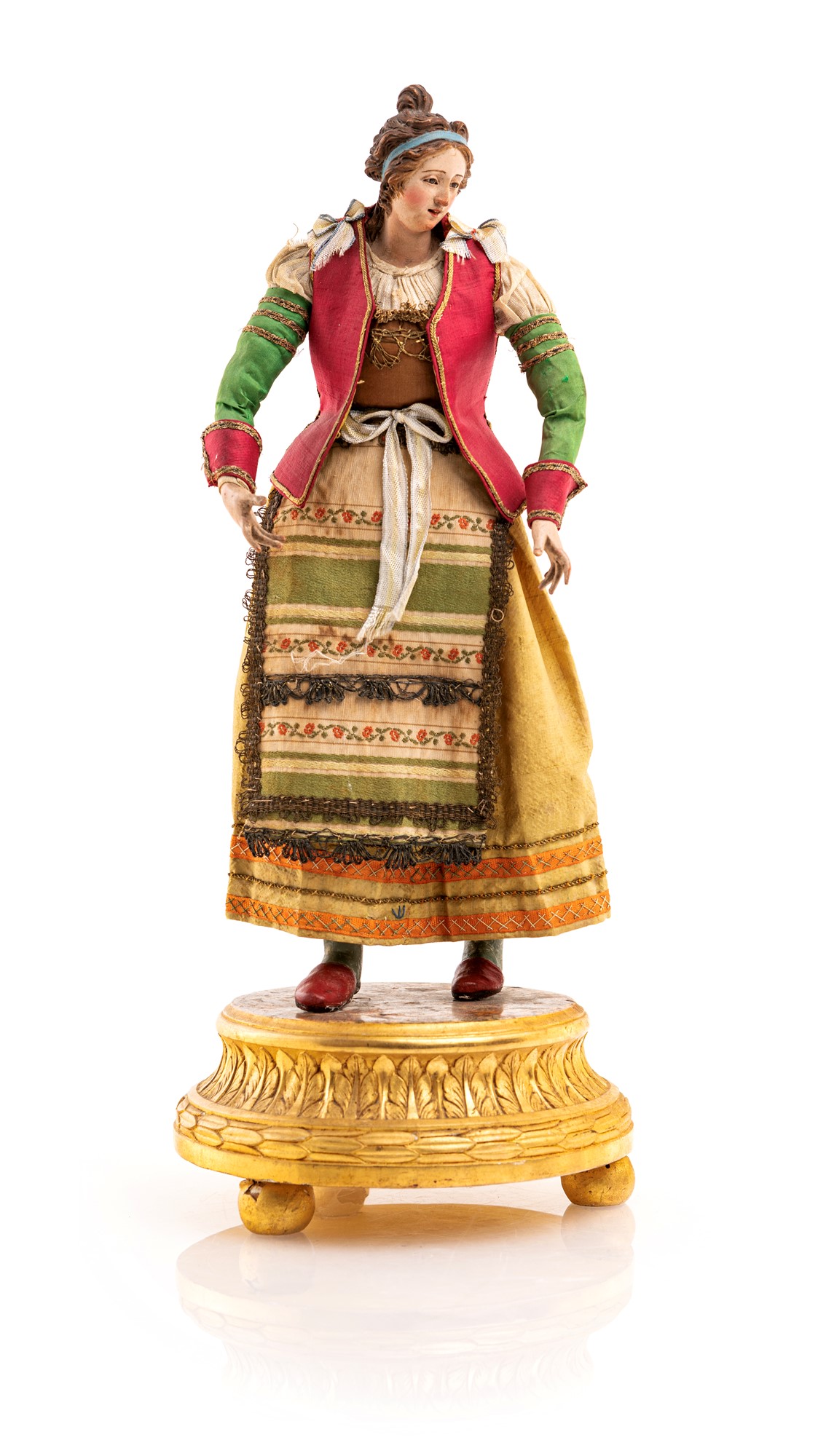 Contadina ricca con chignon camicia plissettata bianca, maniche verdi con polsi rossi così come il gilet rifinito da ricami dorati; corsetto marrone, gonna gialla, sinale a righe con gallonature, scarpe rosse. Stante su piedistallo circolare in legno dorato con fascia intagliata a palmette, piedi a sfera altezza cm 34 - con la base cm 42