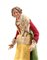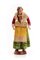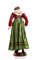 Donna ricca con chignon collana al collo, un orecchino a forma di fiore; camicia plissettata bianca, corpetto beige, scialle ricamato sulle spalle; corpetto rosso da cui escono i polsini della camicia, ampia gonna verde, sinale beige, pantofole ai piedi altezza cm 35,5