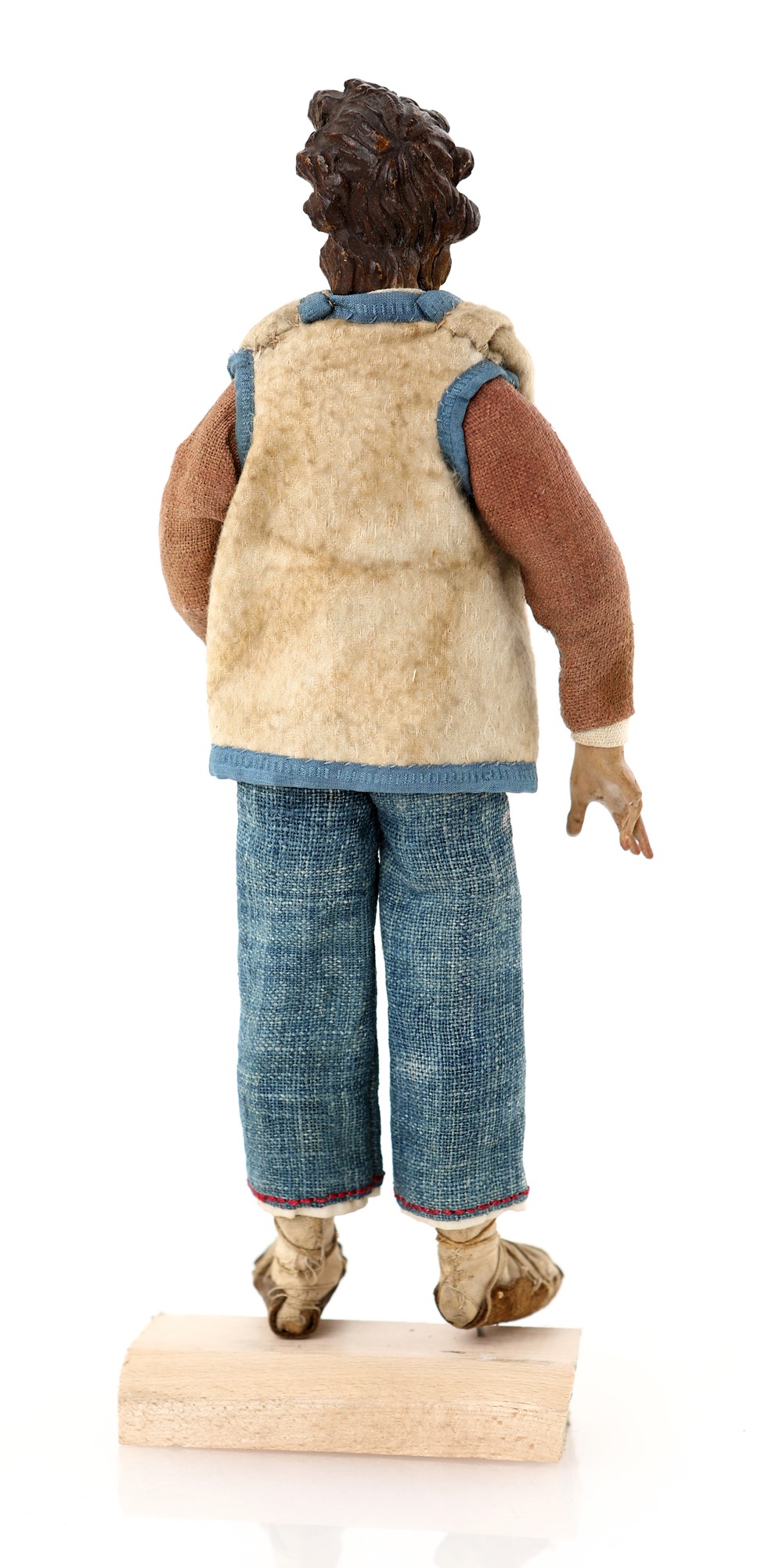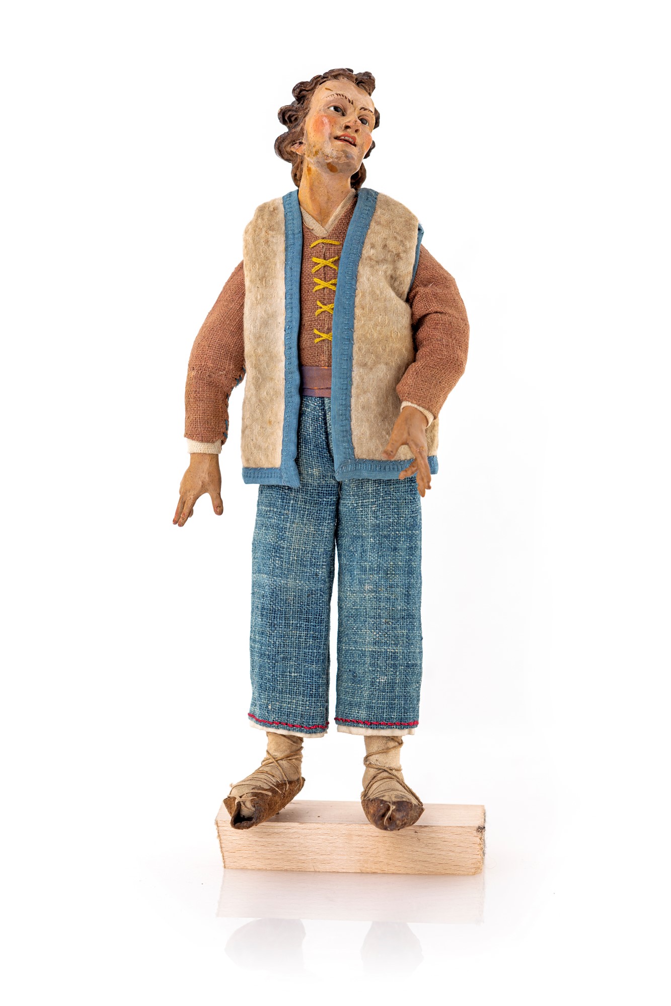 Giovane rustico con capelli mossi e bocca socchiusa; camicia marrone, gilet in pelle di pecora, pantaloni azzurri e ciocie ai piedi altezza cm 26,5 XX secolo