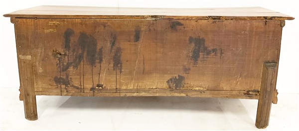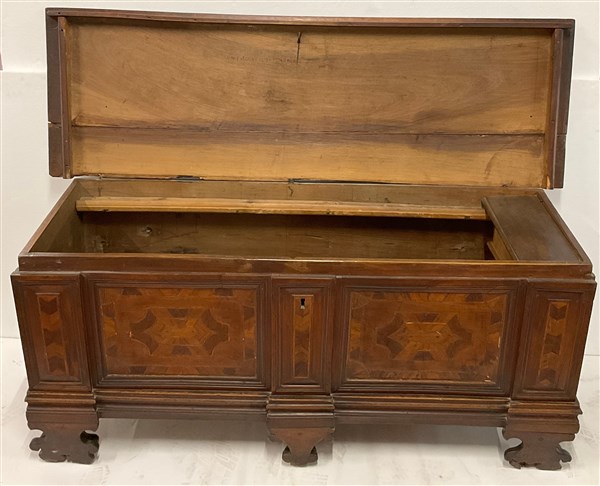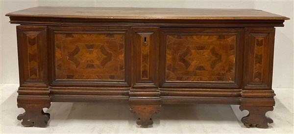 Cassapanca in noce con fronte a pannellature intarsiate in legni vari a motivi geometrici, piedi sagomati. Secolo XVIII (cm 171x71x56) (difetti e restauri)