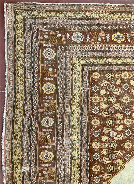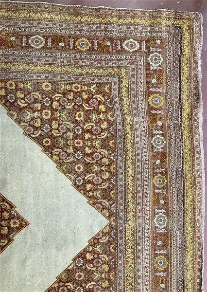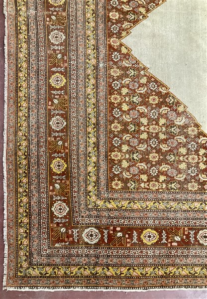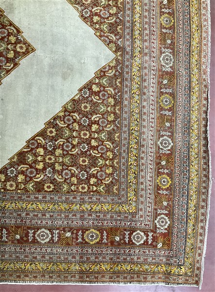 Tappeto Tabriz, Persia, inizio secolo XX. Decoro con medaglione esagonale nei toni del marroncino su campo bianco a tinta unita, motivo decorativo Herati del medaglione analogo agli angolari, molteplici bordure e bordura Herati principale su fondo marroncino (cm 350x253) (difetti)