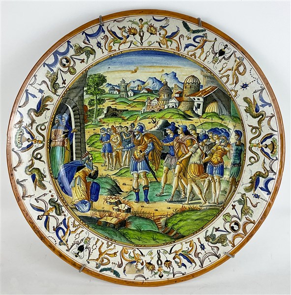 Grande piatto da parete in maiolica dipinta in policromia con scena storica nel