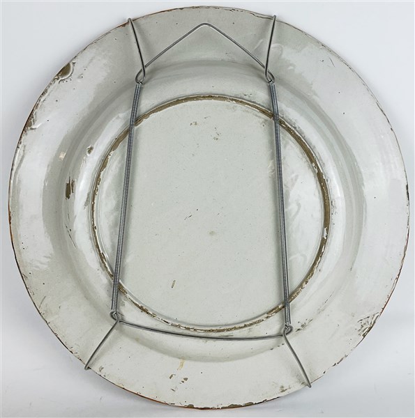 Grande piatto da parete in maiolica dipinta in policromia con scena storica nel cavetto e a grottesche nella tesa (d. cm 45) (difetti)