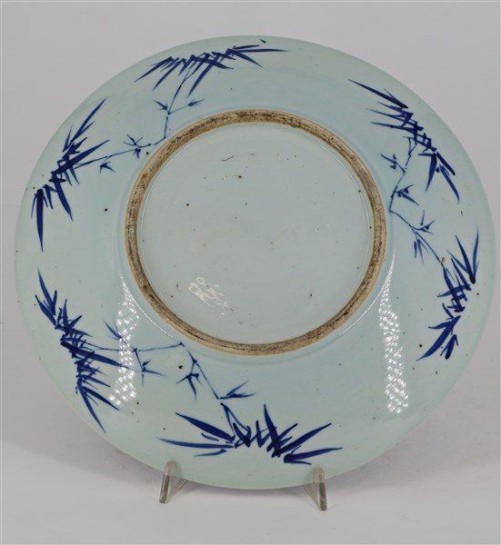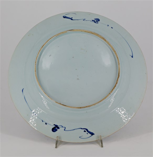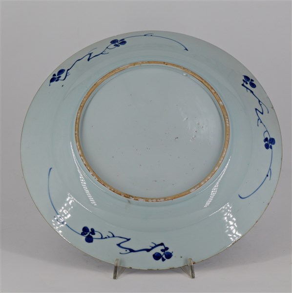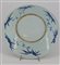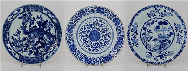 Tre diversi piatti in porcellana bianca e blu decorati con motivi floreali e uno con fenice