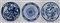 Tre diversi piatti in porcellana bianca e blu con motivi floreali e uno con fenice