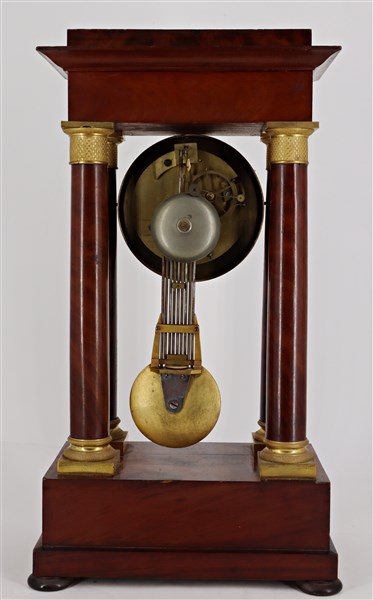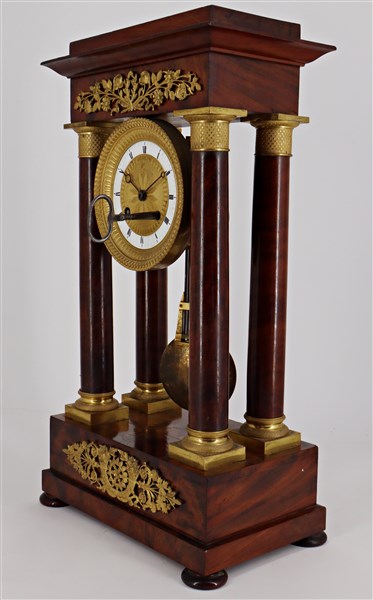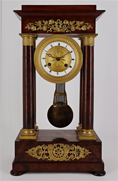 Orologio a portico in legno e bronzo dorato. Quadrante a fascia in smalto bianco a numeri romani. Movimento a due treni con suoneria delle ore e mezze su campanello. Francia, secolo XIX (h cm 47) (difetti)