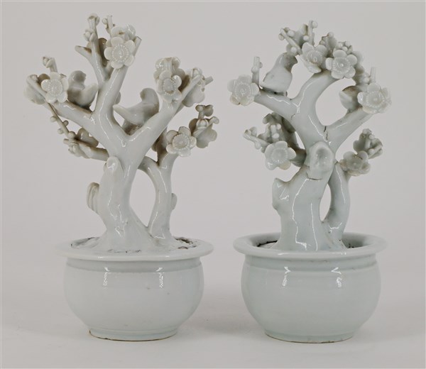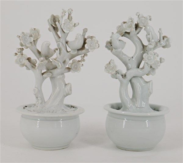 Coppia di miniature di giardiniere in porcellana blanc de chine con rami di fiori di pruno fioriti e uccellini