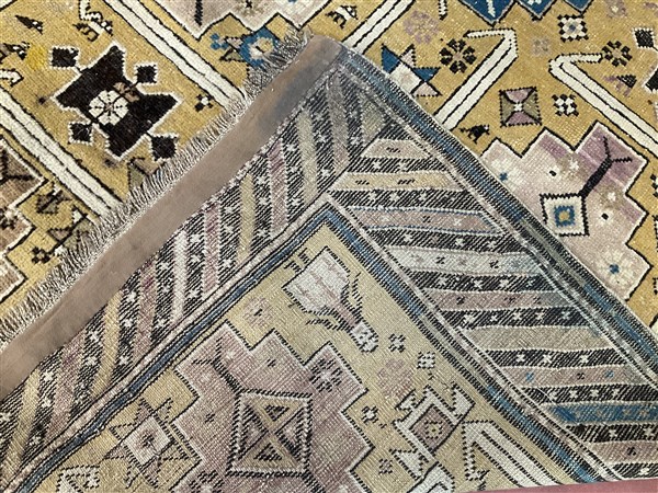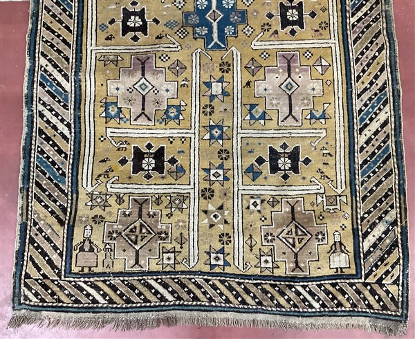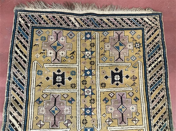 Tappeto Shirwan, Caucaso, fine secolo XIX. Decoro con due file di medaglioni su campo giallo, bordura a baiadera (cm 170x105) (difetti)