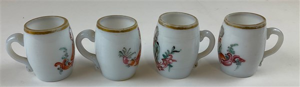 Manifattura del secolo XIX. Quattro bicchieri ad un'ansa in vetro lattimo dipin