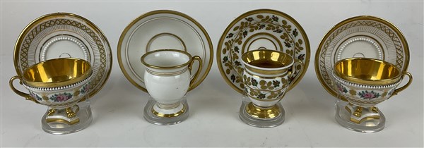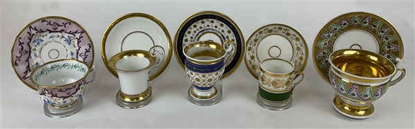 Manifatture diverse, secolo XIX. Lotto composto da nove diverse tazze con piatto in porcellana, alcune decorate in policromia, profili in oro (lievi difetti)
