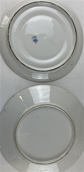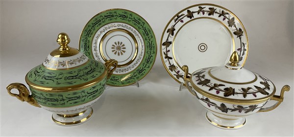 Manifatture diverse, secolo XIX. Due tazze da puerpera biansate con coperchio e piatto in porcellana, decorate a motivi stilizzati su fondo verde e tralci d'uva, profili in oro (difetti)