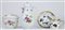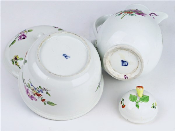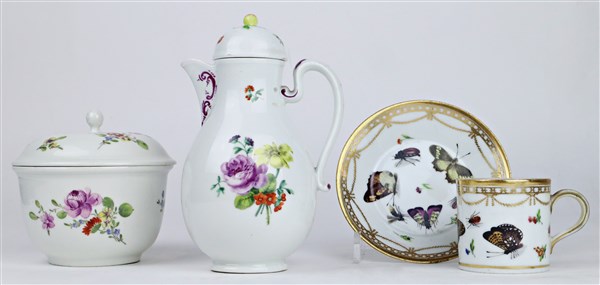 Manifatture diverse, secolo XIX. Lotto composto da una tazza con piattino dipinta in policromia a farfalle, insetti e fiori con profili in oro, una piccola caffettiera con coperchio in porcellana decorata a fiori e presa a frutto (VIenna) ed una zuccheriera con coperchio in porcellana decorata a fiori policromi (difetti)