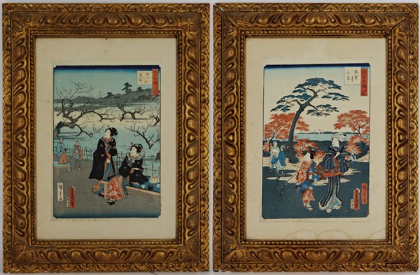 Due stampe da disegni di Kunisada (1786-1865) e Hiroshige II (1826-1869), entrambe dalla serie in formato Oban verticale Trentasei vedute dell’orgoglio di Edo
