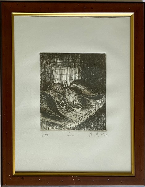 Lotto composto da una litografia di Augusto Murer raffigurante nudo femminile (cm 69x49), firmata e numerata 68/100, un'acquaforte di autore indecifrato raffigurante pesci (foglio cm 39x29) firmata e numerata 89/99 e una riproduzione raffigurante profilo maschile (cm 70x51)