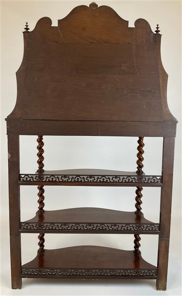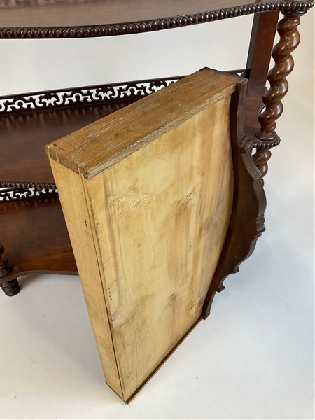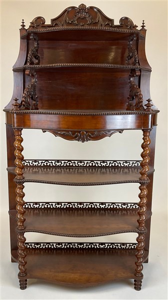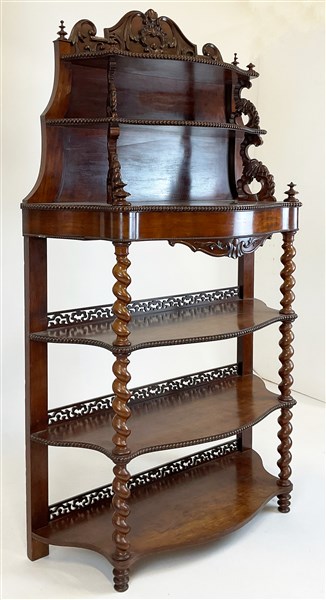 Etagère in mogano a cinque ripiani, fronte a un cassetto, bordure perlinate e traforate, montanti a colonna tortile. Secolo XIX (cm 106x160x40) (difetti)