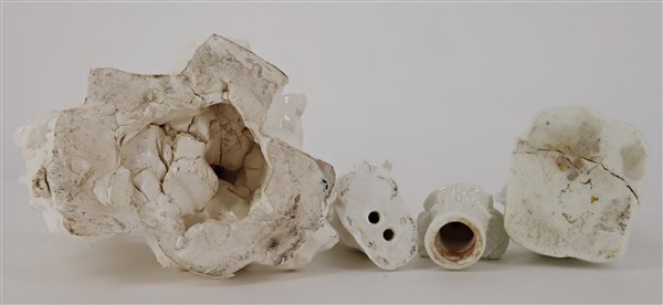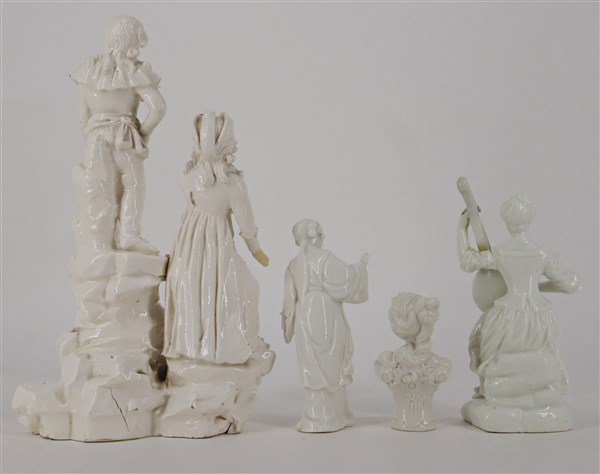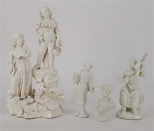 Manifatture diverse, secolo XVIII-XIX. Lotto composto da un gruppo, due figurette e un pomolo da bastone in porcellana bianca (difetti e restauri)
