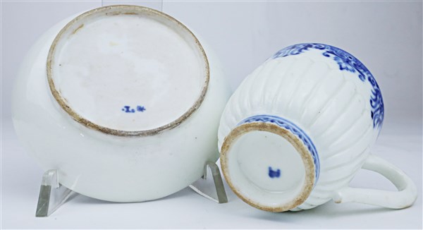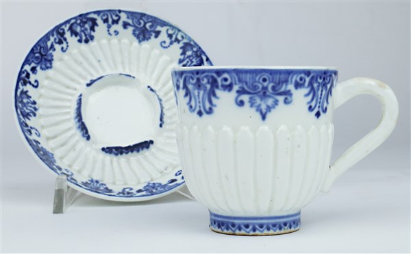 Manifattura di Saint Cloud, prima metà secolo XVIII. Tazza con piattino "trembleuse" in porcellana in parte baccellata e decorata nei toni del blu a motivi vegetali e concatenati (difetti)