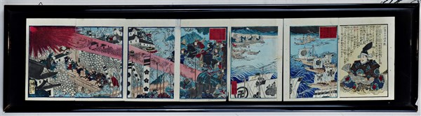 Gruppo di sette xilografie in un'unica cornice Giappone, periodo Meiji (1868-1