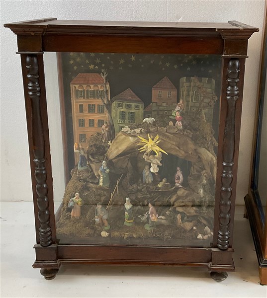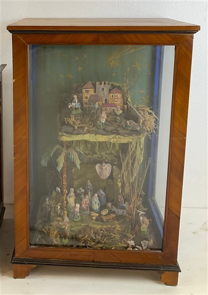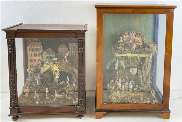 Lotto composto da due diversi presepi in materiali vari entro teca in legno (cm 44x65x32) (difetti)