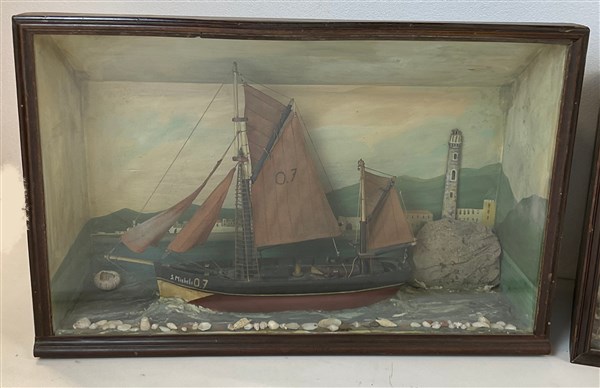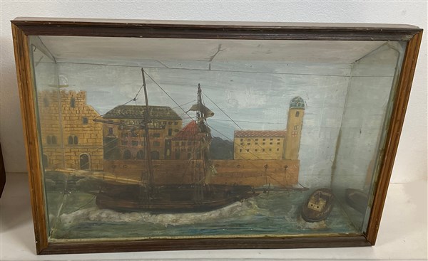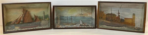 Lotto composto da tre diversi diorama in materiali vari raffiguranti velieri in teca (cm max 71x48x34) (difetti)