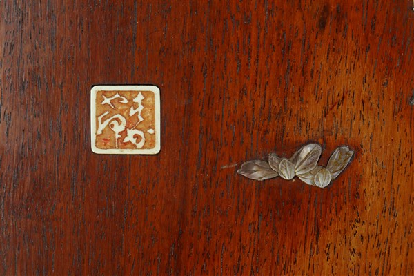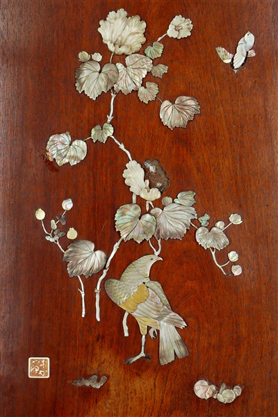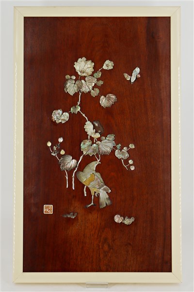 Pannello in legno intarsiato in madreperla con rapace e ramo di fiori (cm 59x34) (difetti e mancanze) In cornice