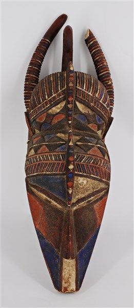Arte africana. Maschera rituale in legno decorata con terre policrome