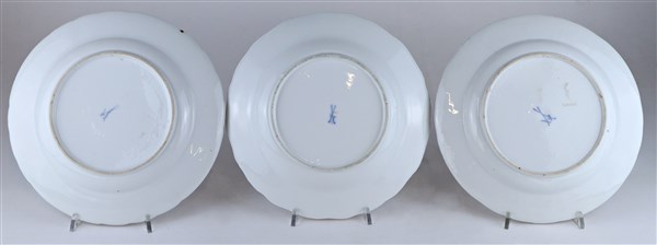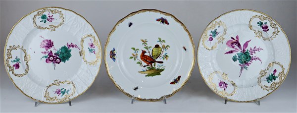 Manifattura di Meissen, seconda metà del secolo XVIII. Coppia di piatti in porcellana decorata a fiori entro riserve con profili in oro e bordure a rilievo (d cm 24,5). Unita ad un piatto con decoro a volatili e insetti di epoca successiva (difetti)