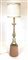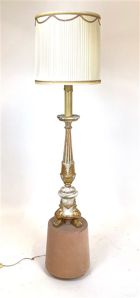 Candeliere in legno intagliato, dipinto e dorato con fusto a balaustro scanalato, piedi ferini. Secolo XIX (h cm 74) Montato su base troncoconica e a lampada con paralume in tessuto (h tot. cm 167) (difetti)