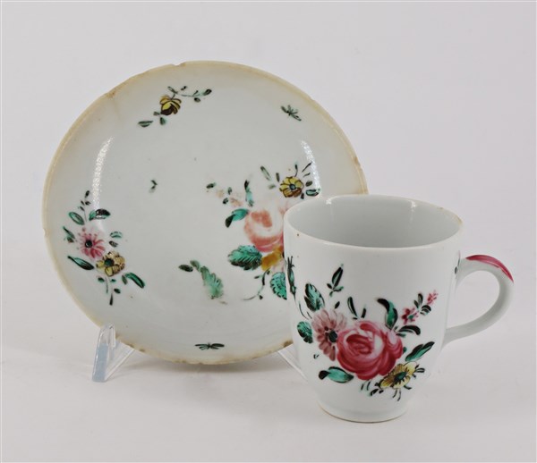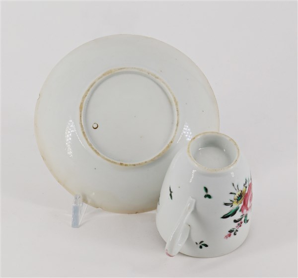 Manifattura di Ginori, Doccia, fine secolo XVIII. Tazza con piatto in porcellana decorata in policromia al mazzetto (d cm 12,5) (difetti)