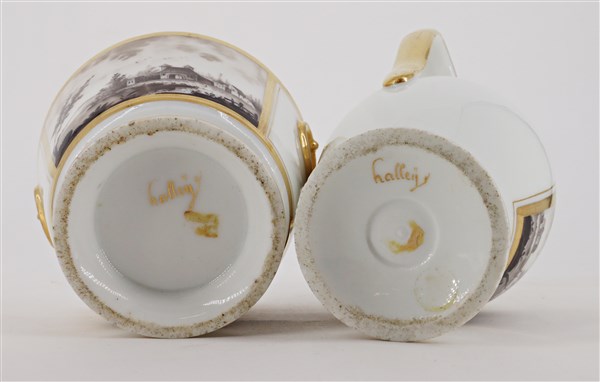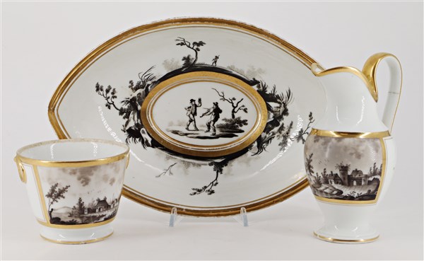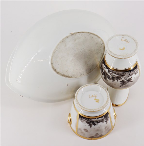 Manifattura Halley, Parigi, inizio del secolo XIX. Lotto composto da un bacile, un versatoio e zuccheriera in porcellana decorata "en grisaille" a paesaggio e figure con profili in oro, marchi in oro sul fondo (cm max 33x21,5) (difetti, restauro e zuccheriera mancante del coperchio)
