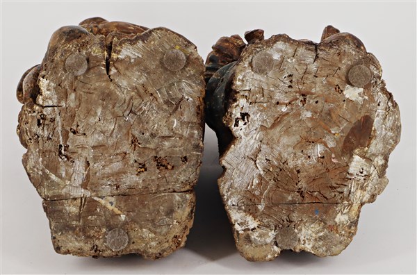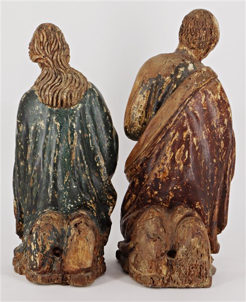 Scultore del secolo XVII. "Vergine" e "San Giuseppe", legno intagliato con tracce di policromia (h max cm 43,5) (difetti e mancanze)