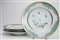 Manifattura di Vienna, secolo XIX. Gruppo di quattro piatti in porcellana decorata in policromia nel cavetto a frutti sparsi, bordura a squame in verde con profili in oro (d cm 24,5) (difetti)
