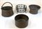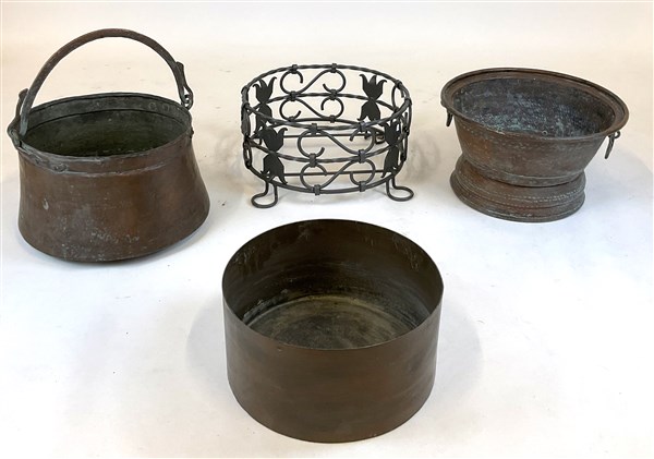 Lotto composto da due bacili in rame dei quali uno biansato e uno con manico basculante, uniti ad un portavaso in ferro battuto con vasca in rame (difetti)
