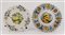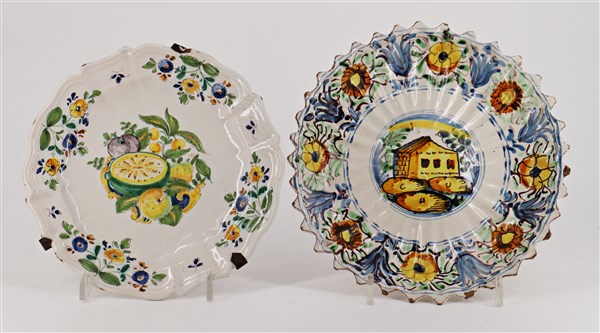 Manifatture diverse, secolo XVIII e XIX Lotto composto da un piatto in maiolica decorato in policromia "alla frutta barocca" e fiori e una alzata a crespina in maiolica decorata in policromia a paesetto e fiori (d max cm 25) (difetti)